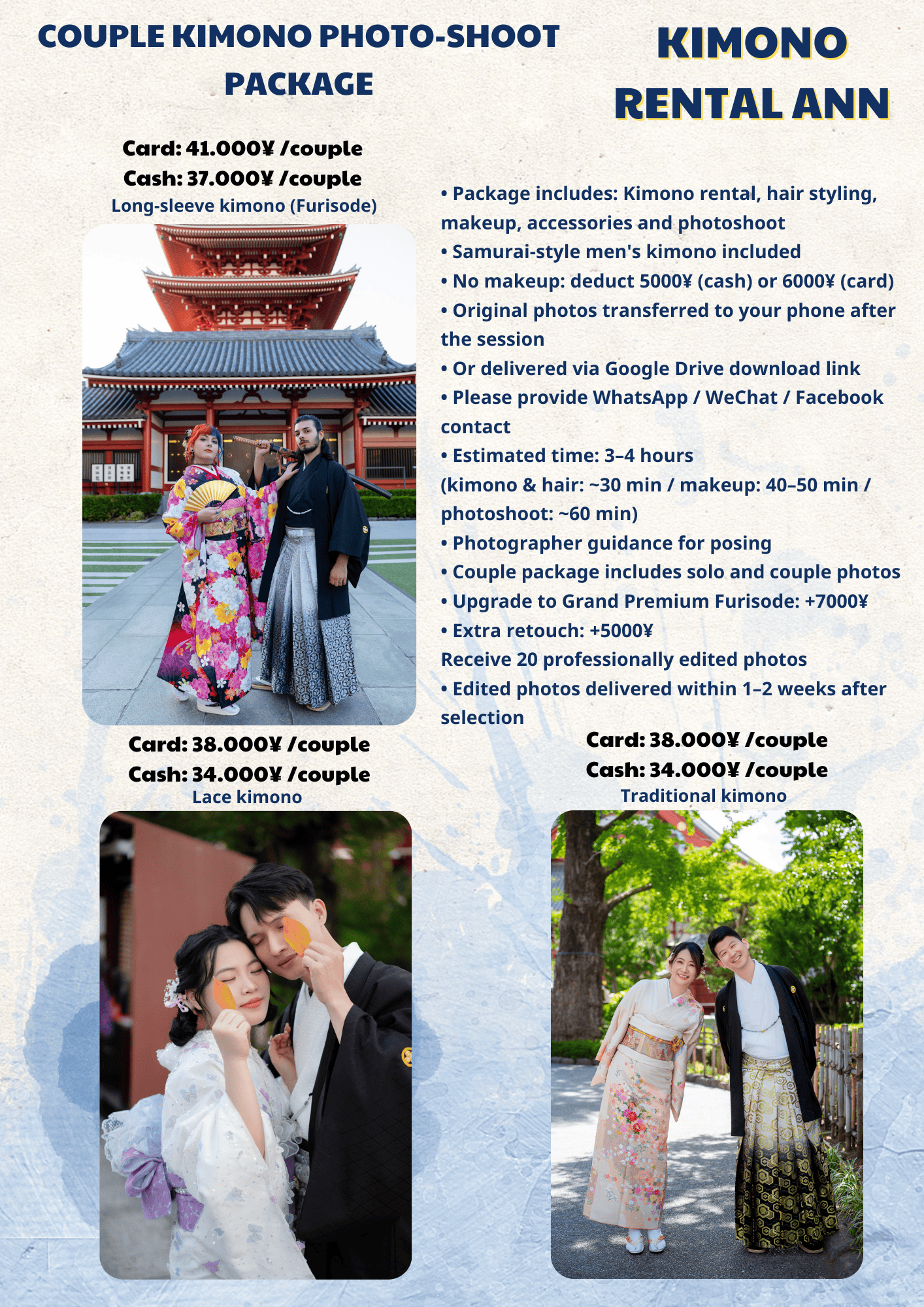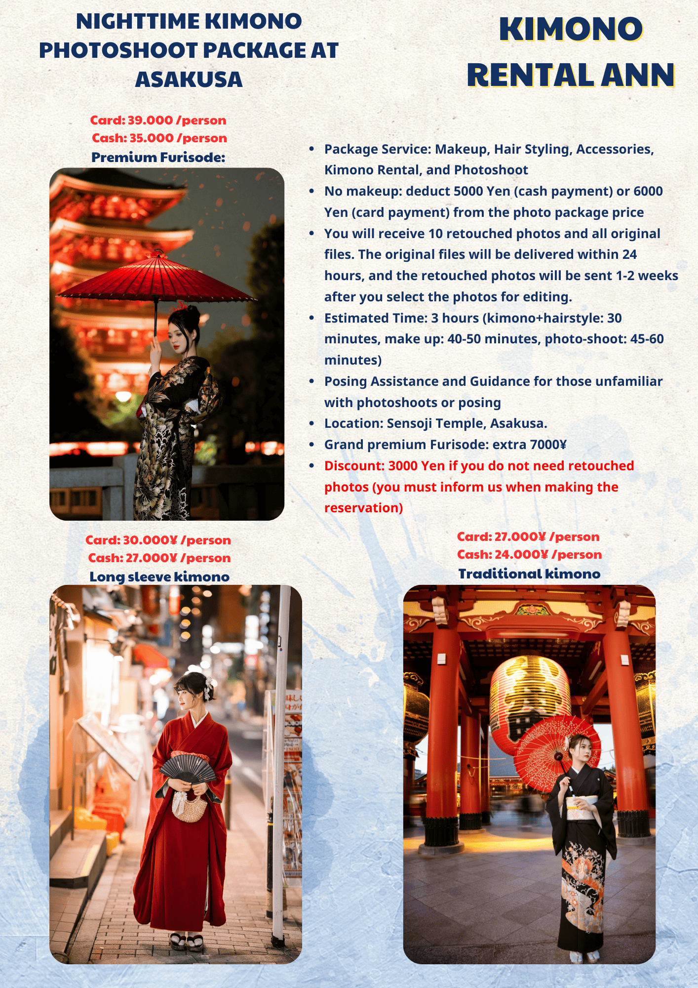 Our kimono photoshoot Asakusa packages are designed for travelers who want a timeless experience in Tokyo.