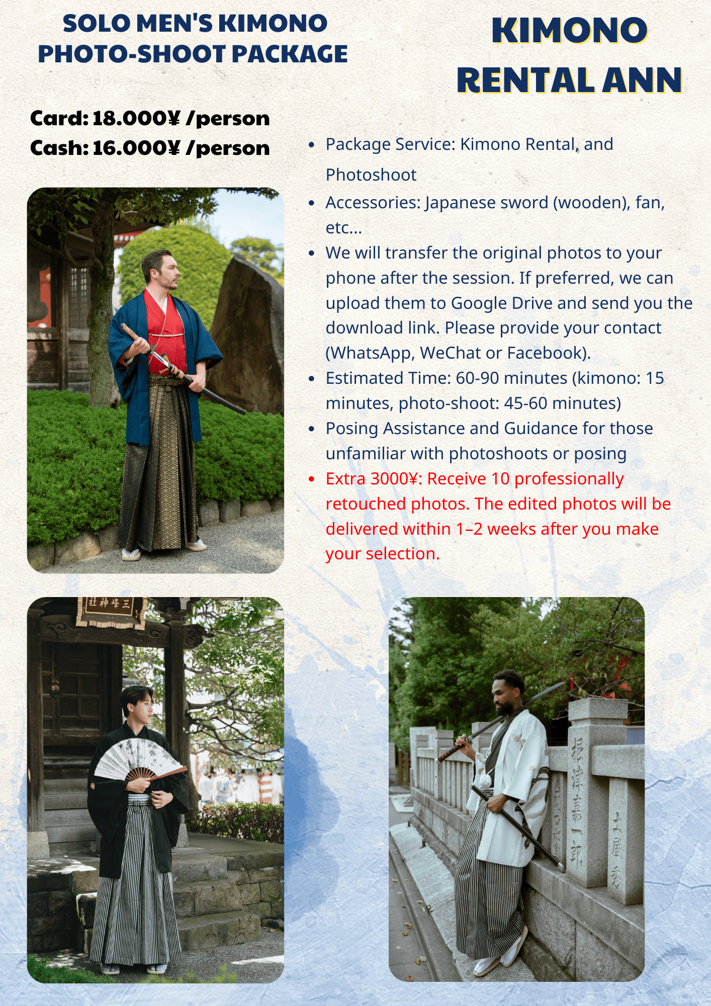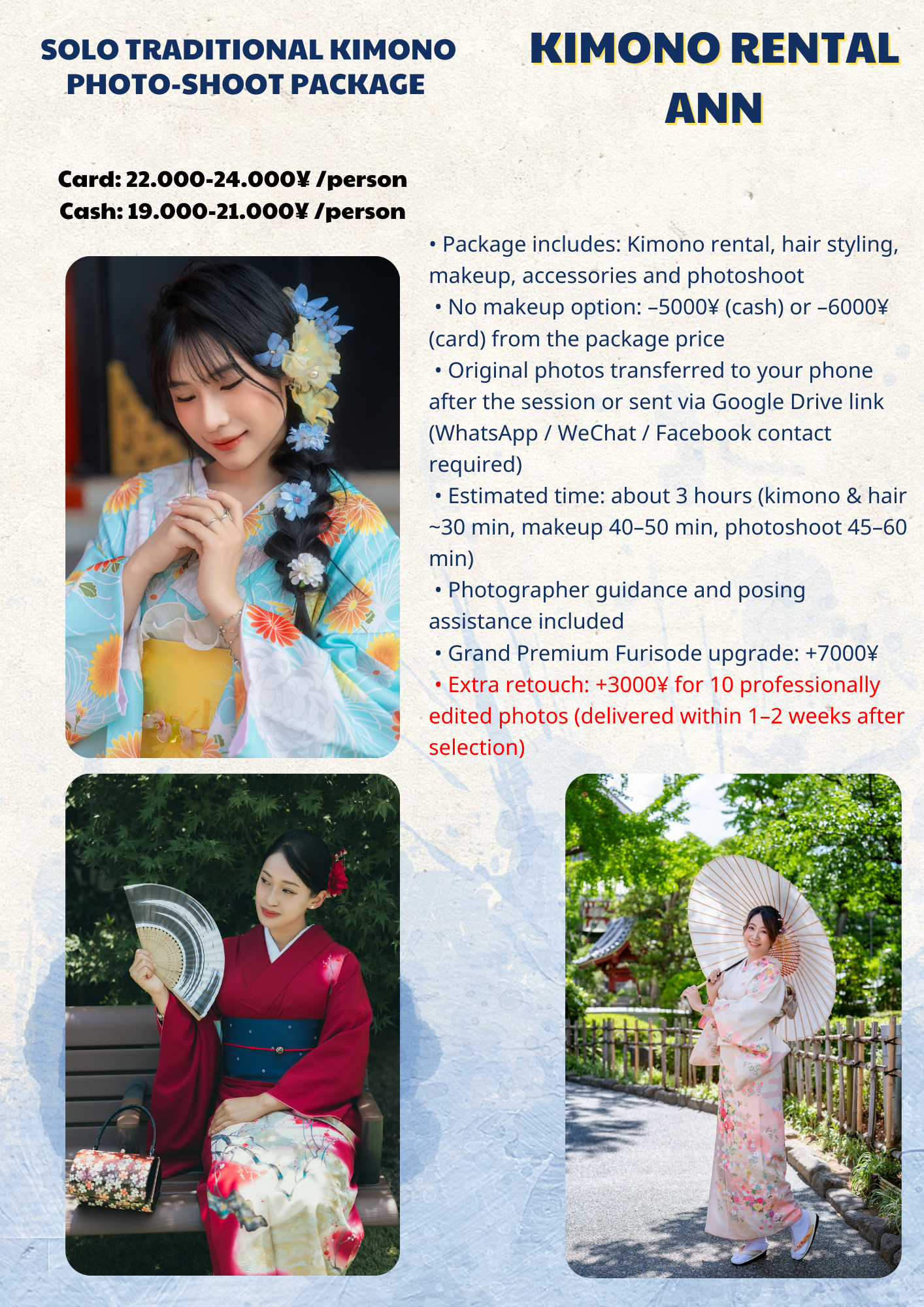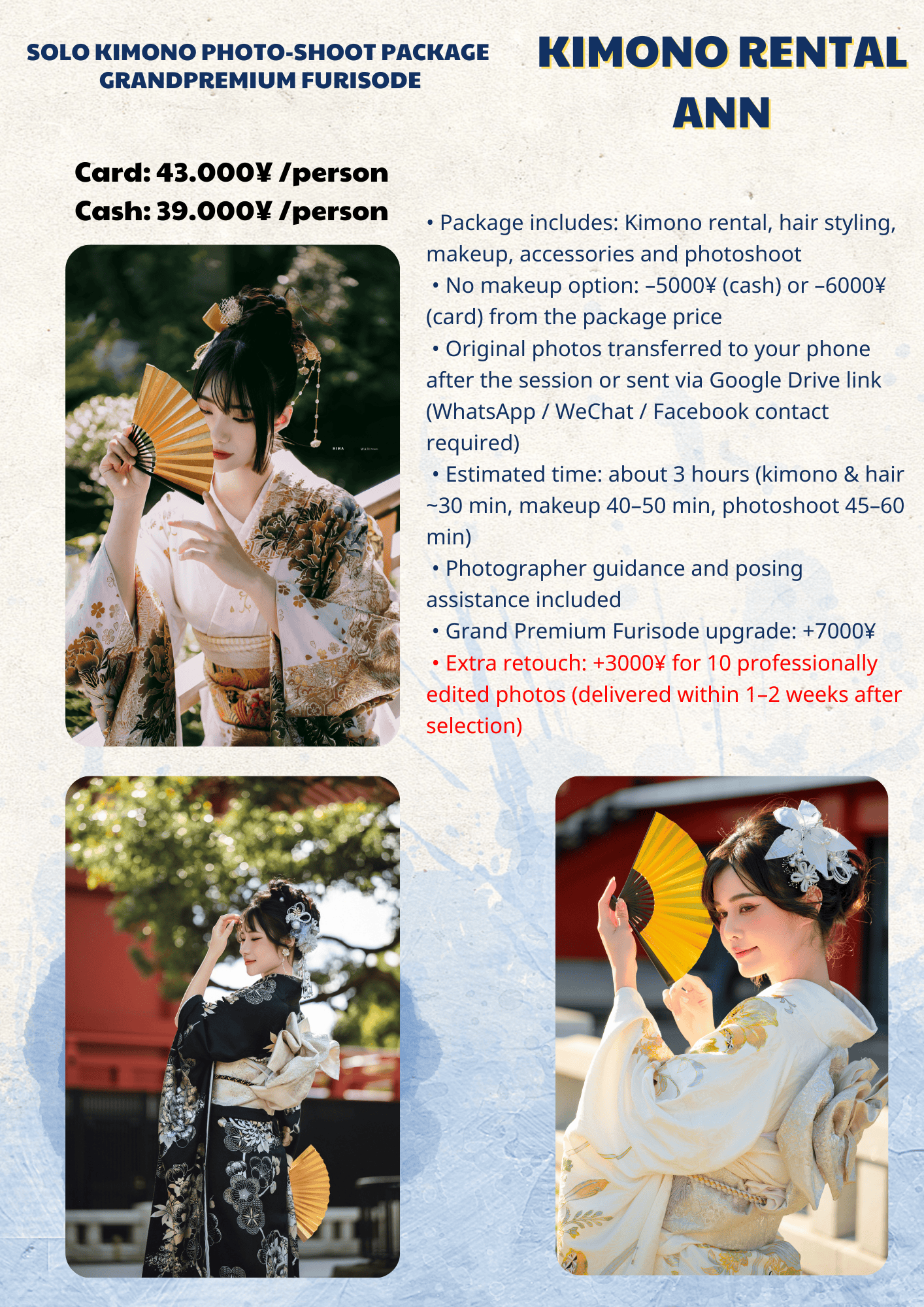 While we take care to provide a safe and comfortable environment, Kimono Rental Ann is not responsible for accidents, injuries, or personal belongings during the session.