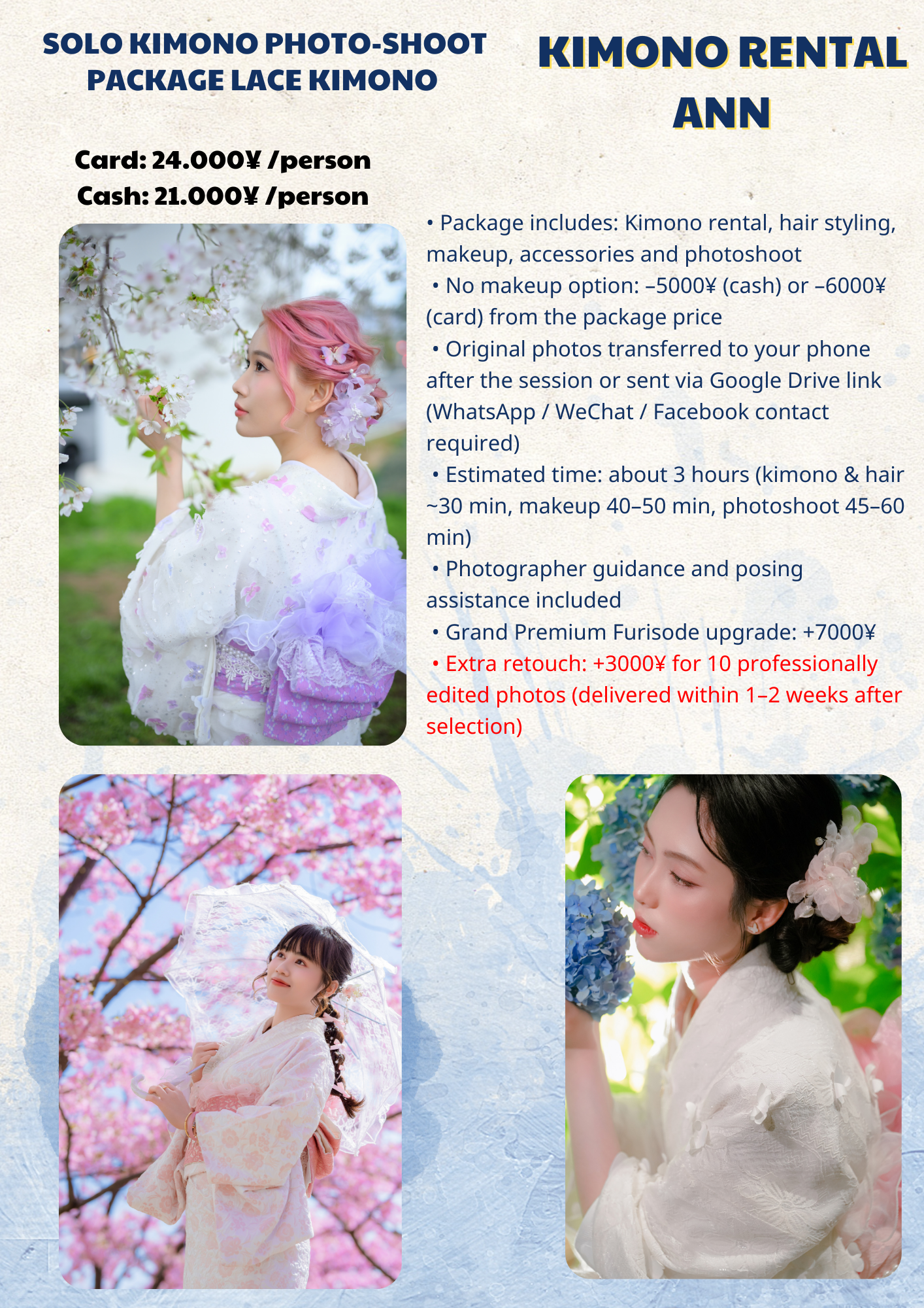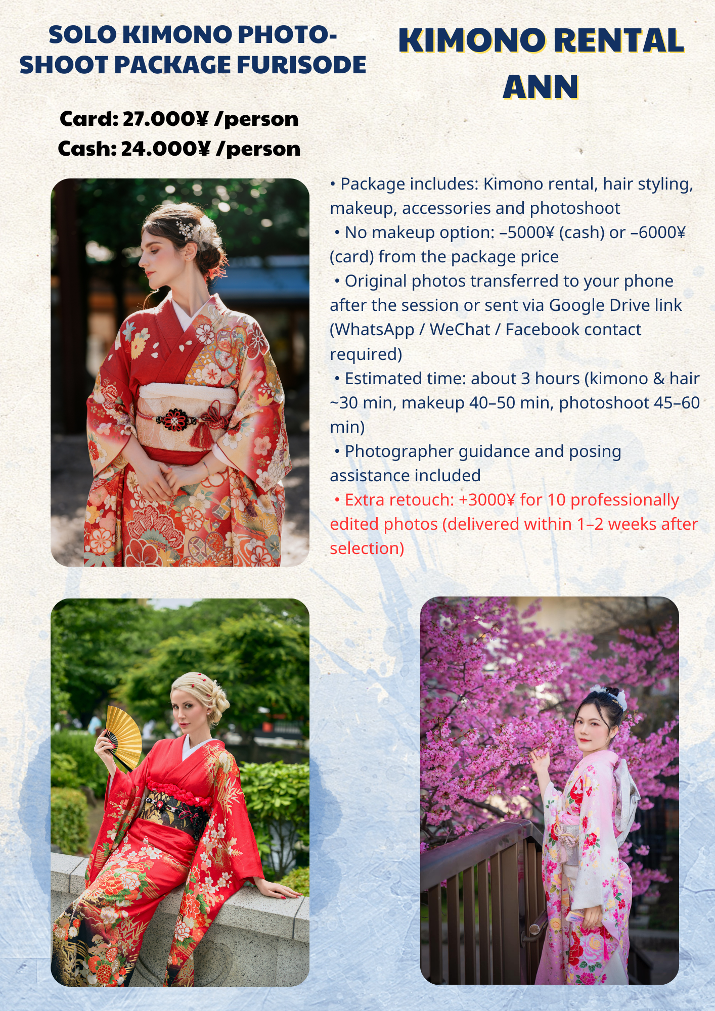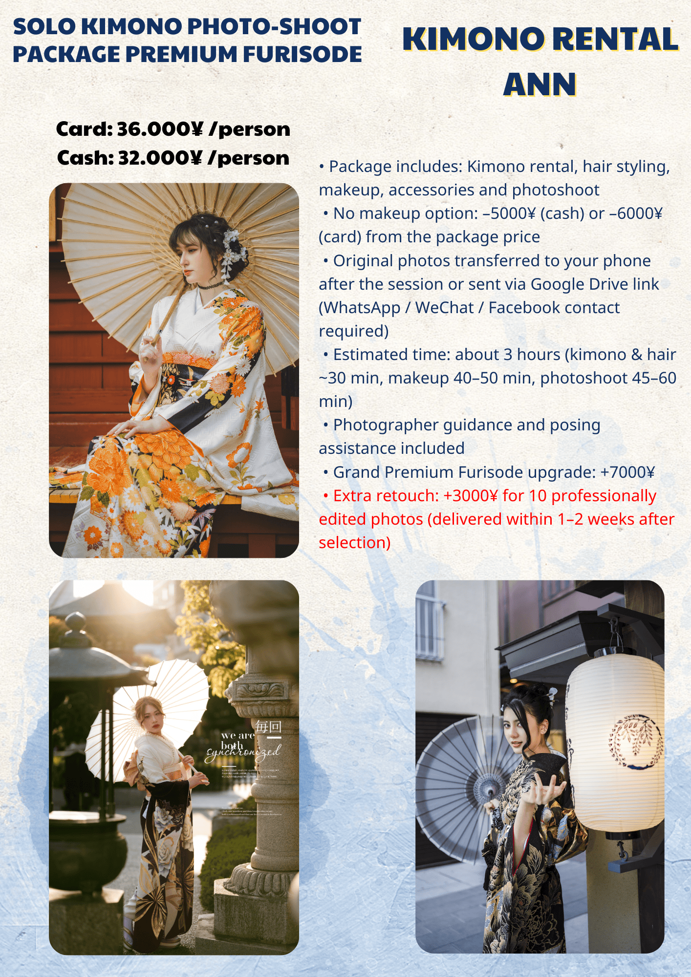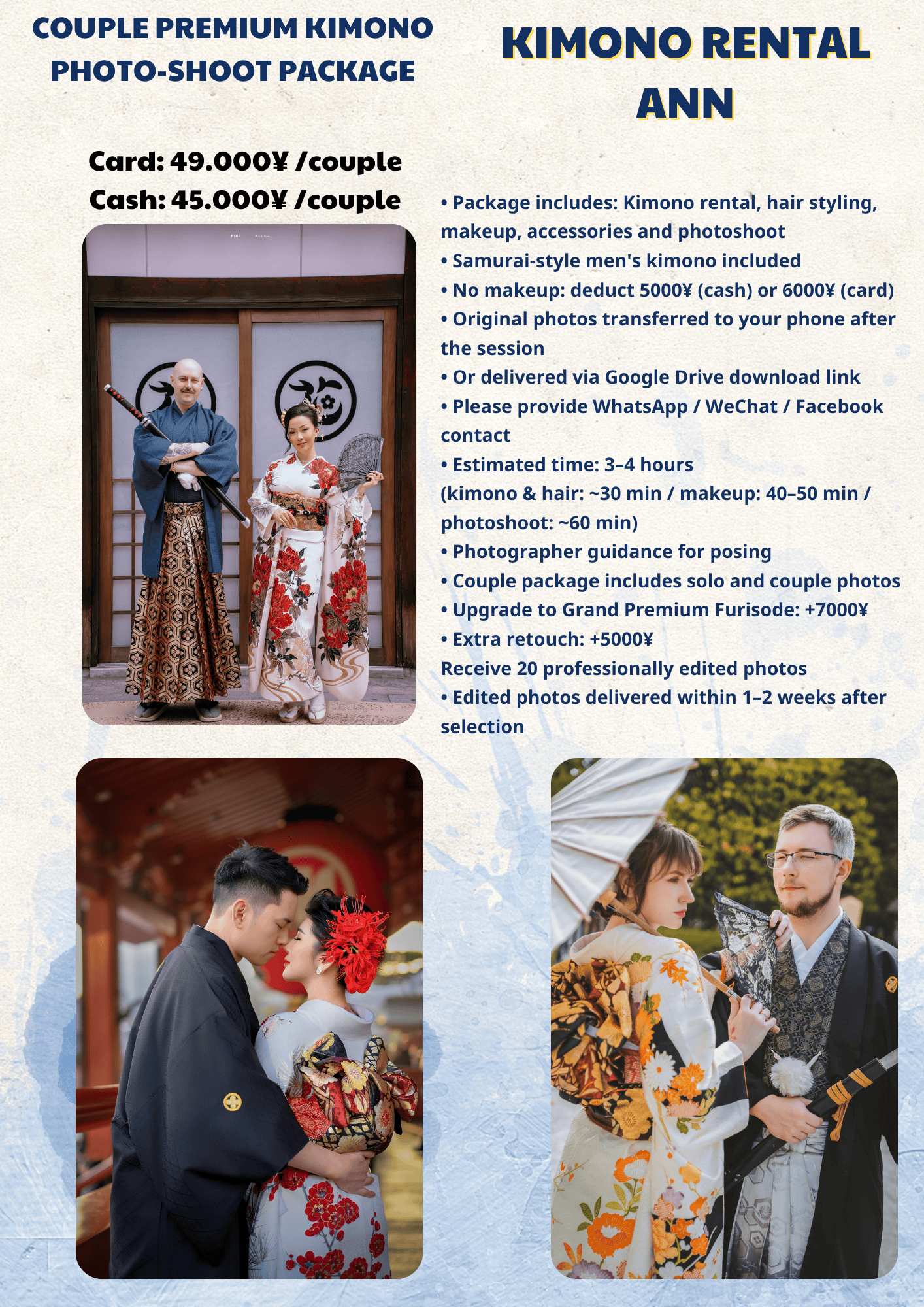 While we take care to provide a safe and comfortable environment, Kimono Rental Ann is not responsible for accidents, injuries, or personal belongings during the session.